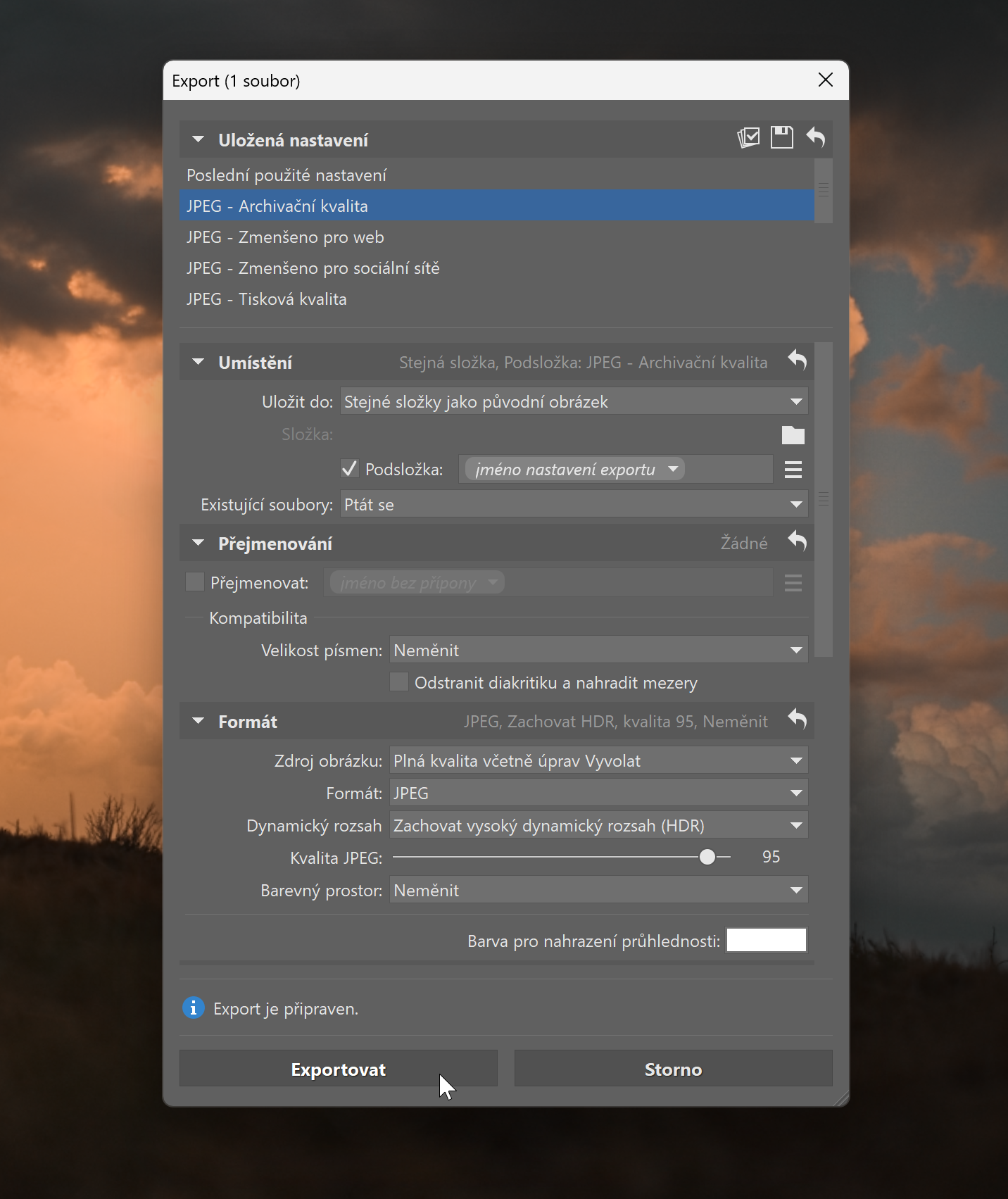 Pak už jen musíte zvolit, kam chcete fotky exportovat a vybrat kvalitu a další parametry.