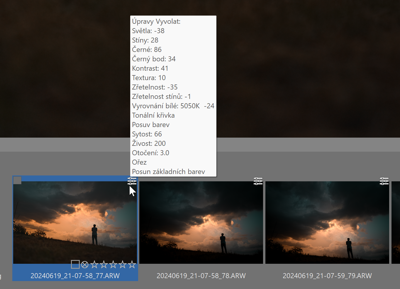 Fotografii s nedestruktivními úpravami poznáte v Zoner Photo Studiu X podle ikony tří vodorovných posuvníků v horní části snímku. Když na ni najedete myší, zobrazí se seznam provedených úprav.